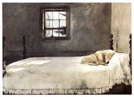 Over the years Andrew used several other friends and neighbors as his models, the Olsons, his neighbors in Cushing, Maine and the Kuerners, his neighbors in Chadds Ford, Pennsylvania however many of his pieces contain no people. Andrew himself said his biggest failing was too much subject in this work. Whereas his father’s illustrations were full of action and drama, Andrew’s work contained images of absence, silence, desolation but also expection. He liked to portray fall and winter scenes with the powerful structure of the landscape prominent and a promise of what’s to come lying beneath the surface. Much of his work has a melancholy feel to it that Andrew preferred to call